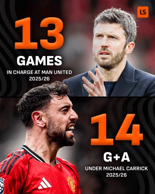 数据显示,卡里克本赛季执教曼联13场比赛,B费已经在其麾下直接参与14粒进球,场均制造进球超过1球,进攻影响力相当突出。